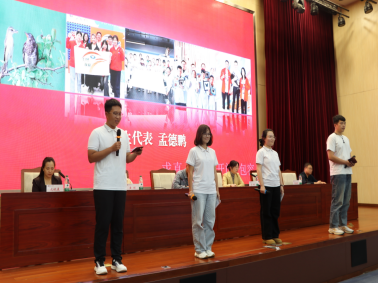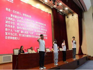一代代生科人的精神品格,同样在今日校园里熠熠生辉。在“挺膺担当强国有我”环节,我校第28届研究生支教团成员、2203班王菲琳;学生党员、国家励志奖学金获得者、2203班韩淑琴;生物学2023级博士生胡雪峰;自然观察社团负责人孟德鹏分享了他们用实际行动诠释“挺膺担当”的奋斗故事,感染了全场新生,接着现场进行了庄严宣誓。全体学子举起右拳,跟随在校生代表许下铮铮誓言。“立鸿鹄志,求真学问,做实干家”每一句承诺都凝聚着生科学子对学术的敬畏、对求知的追求、对家国的热爱。这是青春的承诺,是对未来责任与使命的挺膺担当。