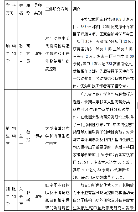 学位点目前设置动物生物学、植物生物学、细胞生物学、逆境生物学4个学科方向。带头人如下表所示: