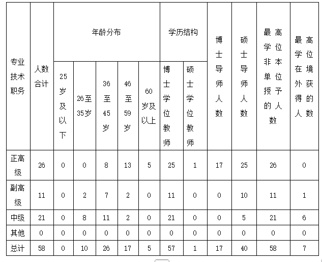 学位点现有专任教师58人,其中正高级职称26人,副高级职称11人,中级职称21人。具体如下表: