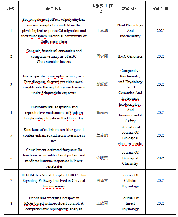 2025年,学生在多项学科竞赛中成绩优异,在第九届全国大学生生命科学竞赛中获国家级一等奖3项、三等奖2项;在中国国际大学生创新大赛等赛事中也取得佳绩。“绿水”“抗菌肽生物反应器”项目入围世界工程日黑客马拉松全球TOP15。研究生发表代表性论文如下: